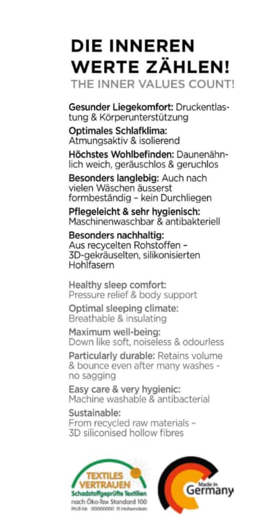 Füllung: 3D-gekräuselte, silikonisierte Hohlfaser (100% Polyester)