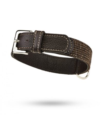 Kalbsleder italienischer Herkunft, Woll-Baumwollstoff mit Pied de Poule Muster in dunkelbraun, alle Metallteile in einem Palladium Bad bearbeitet.