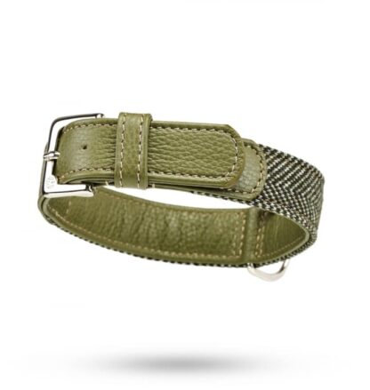 Kalbsleder italienischer Herkunft, Woll-Baumwollstoff mit Zick-Zack-Muster in Grün, alle Metallteile in einem Palladium Bad bearbeitet.