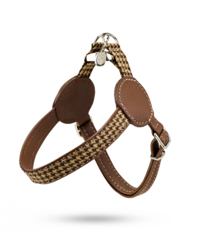 Kalbsleder italienischer Herkunft, Woll-Baumwollstoff mit Pied-de-Poule Muster in Haselnuss, ultraleichte Schnalle aus Aluminium, alle andere Metallteile in einem Palladium Bad bearbeitet.